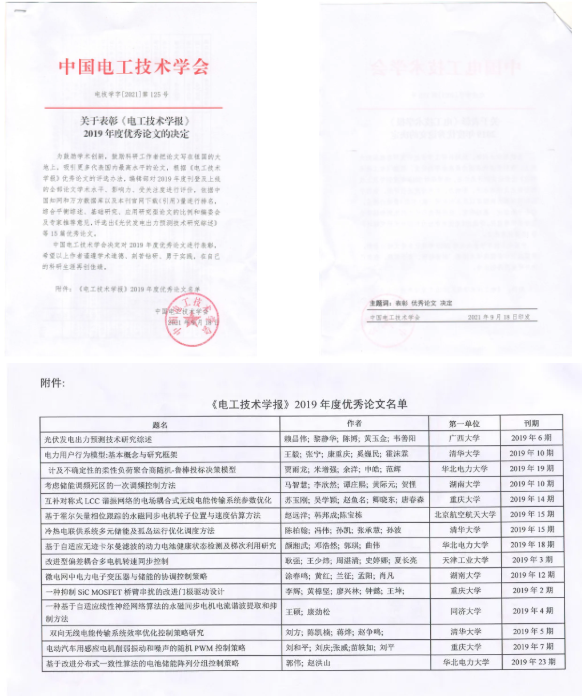 近日,《电工技术学报》编辑部根据其优秀论文的评选办法对2019年度刊登及上线的全部论文的学术水平、影响力、受关注度等进行评价,依据中国知网和万方数据库以及本刊官网下载(引用)量进行排名,综合平衡综述、基础研究、应用研究型论文的比例,编委会及专家推荐意见,评选出15篇优秀论文。我院李辉教授的论文《一种抑制SiC MOSFET桥臂串扰的改进门极驱动设计》、刘和平教授的论文《电动汽车用感应电机削弱振动和噪声的随机PWM...