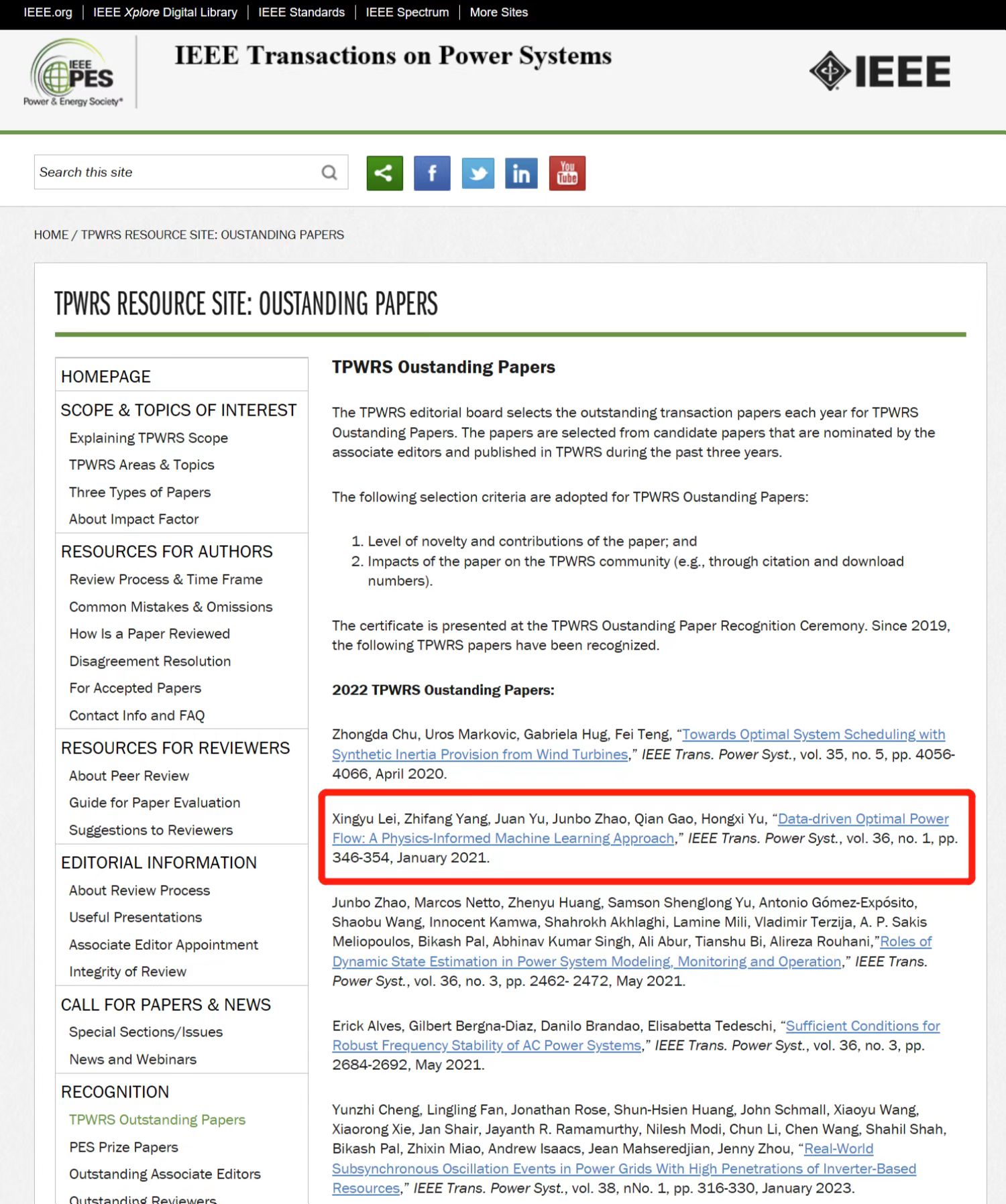 近日,IEEE Power and Energy Society(电气与电子工程师协会电力和能源学会,简称IEEE PES)发布了2022年度IEEE Transactions on Power Systems(《IEEE电力系统汇刊》)最佳论文评选结果。电力系统及其自动化系雷星雨博士后(第一作者)、杨知方教授(通讯作者)、余娟教授等发表的论文《Data-Driven Optimal Power Flow: A Physics-Informed Machine Learning Approach》获评最佳论文,论文合作者为康涅狄格大学赵俊博助理...