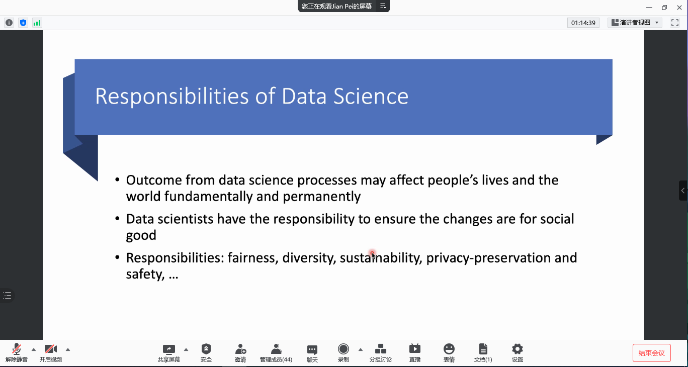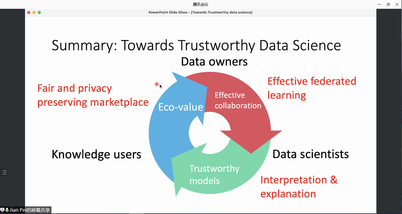 To summarize the lecture, Prof. Pei stated that data science mainly involves three parties: data owners, data scientists, and industry users, and must solve the three main problems of effective data collaboration, obtaining credible models, and creating ecological value. Prof. Pei also stressed the importance of the sense of responsibility, for that the data science workers have to make sure that it can affect our lives in positive ways.