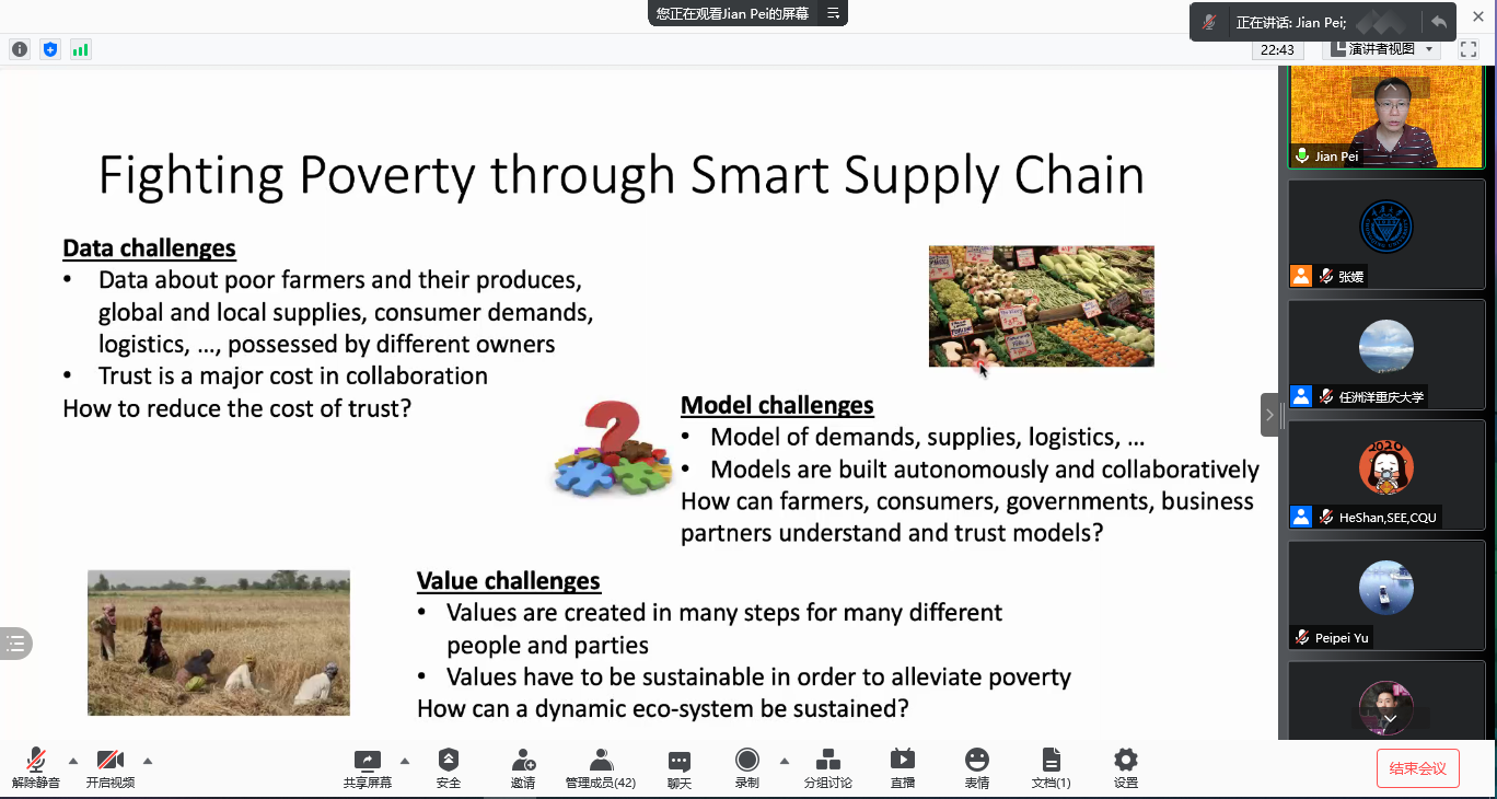 Professor Pei Jian explained how data science can make a positive impact on the world and specifically highlighted the challenges and obstacles that must be overcome. Prof. Pei illustrated how smart industrial chains can be applied to alleviate poverty by explaining the high trust costs faced by data science when dealing with information from different groups, such as agricultural products, customer demands and logistics chains; the challenges of using models to simulate multiple players such as logistics, government, and business partners; and the challenges of working together to maintain a dynamic ecosystem for different businesses and customers to achieve sustainable poverty relief goals. According to Prof. Pei, the use of data analytics to solve the poverty problem is comparable to solving the contradiction between supply and demand of electric power, and Data Science goes far beyond simple algorithms.