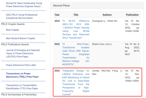 The IEEE Power Electronics Society (PELS) has announced the winners of its flagship IEEE Transactions on Power Electronics (TPEL) Prize Paper Award for 2022. The paper " Integrated Design for Lifetime Extension and ESR Monitoring of Hybrid DC Link in Solid-State Transformer From the Perspective of High-Frequency Ripple Current " by Wei Jinxiao, PhD student in the Department of Power Electronics and Power Transmission, School of Electrical Engineering, Chongqing University, Associate Professor Feng Hao (corresponding author) and Professor Ran Li won the TPEL Second Place 2022 Prize Paper Award. This paper is supported by the State Key Research and Development Program "Multi-Physical Field Comprehensive Analysis and Reliability Evaluation Method of Large Capacity Power Electronic Equipment (2018YFB0905803)" and the National Natural Science Foundation of China "Electric-Thermal, electric-Magnetic Coupling Mechanism and Homogeneous Resolution Coupling Method of Medium Voltage Overcharge System Isolation Barrier (52107179)".