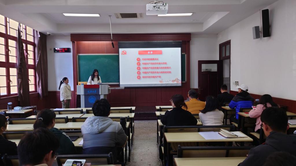 随后,第1党小组的刘睿萌同志和郑烨同志向参会人员传达了十九届六中全会精神,全体党员进行了《中共中央关于党的百年奋斗重大成就和历史经验的决议》文件的专题理论学习。该专题学习包含了历史中的重要决议、中国共产党的百年奋斗历程、中国共产党百年奋斗的历史意义、中国共产党百年奋斗的历史经验以及新时代的中国共产党五个方面。在学习过程中,两位同志适时对与会党员展开相关提问,通过良性的互动,极大提高了与会党员参与的积极性与学习的高效性。