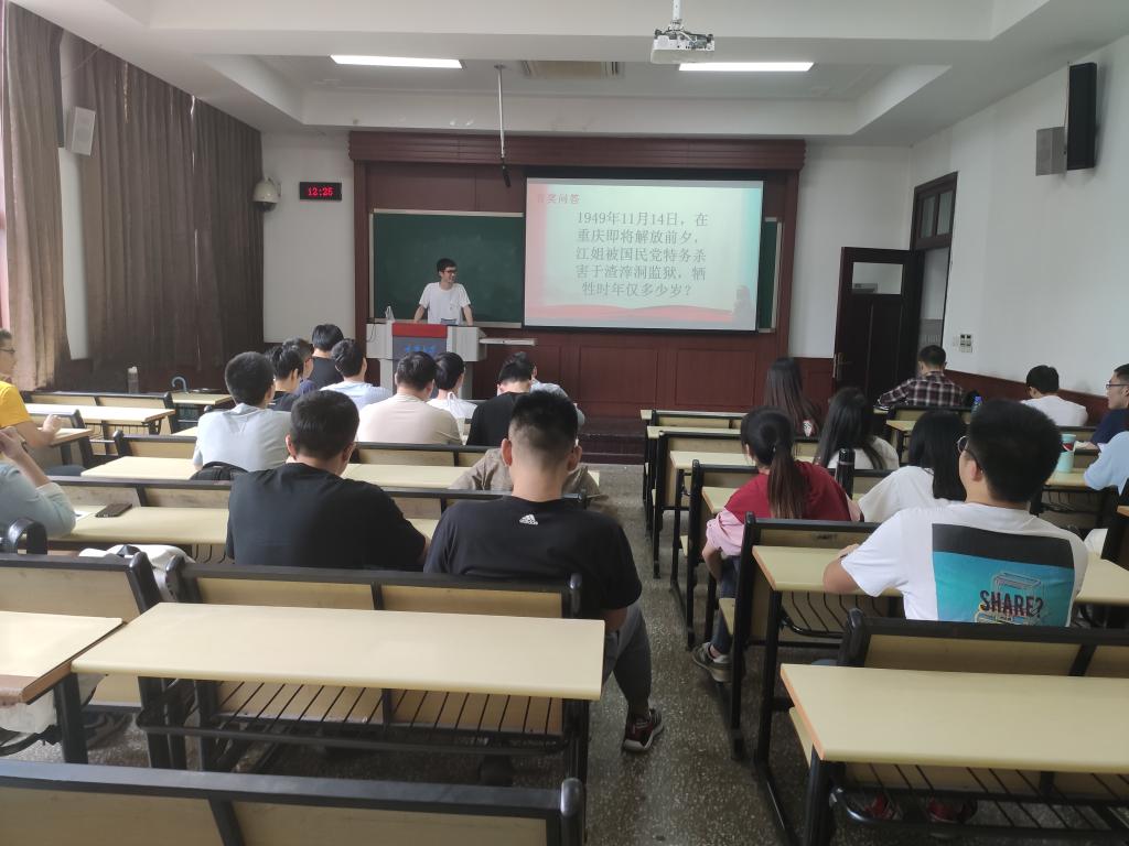 本科一、四支部在A5109教室举办了主题为“观摩红色电影,学习红色精神”的主题党日活动,本次主题党日活动分为主题介绍、有奖竞猜及《我的好朋友江竹筠》电影展播三部分,由吴泽龙和苏禹同志主持。