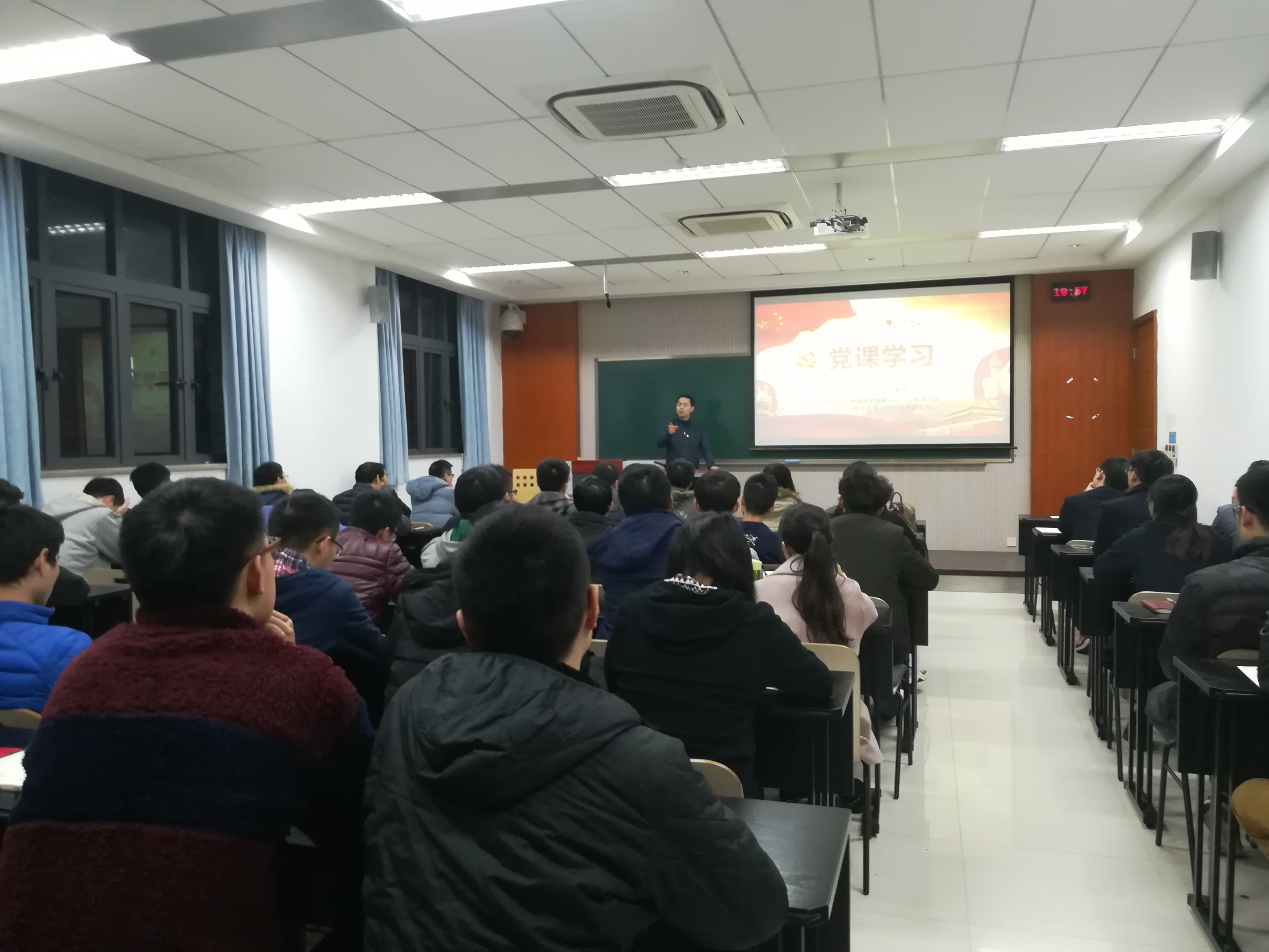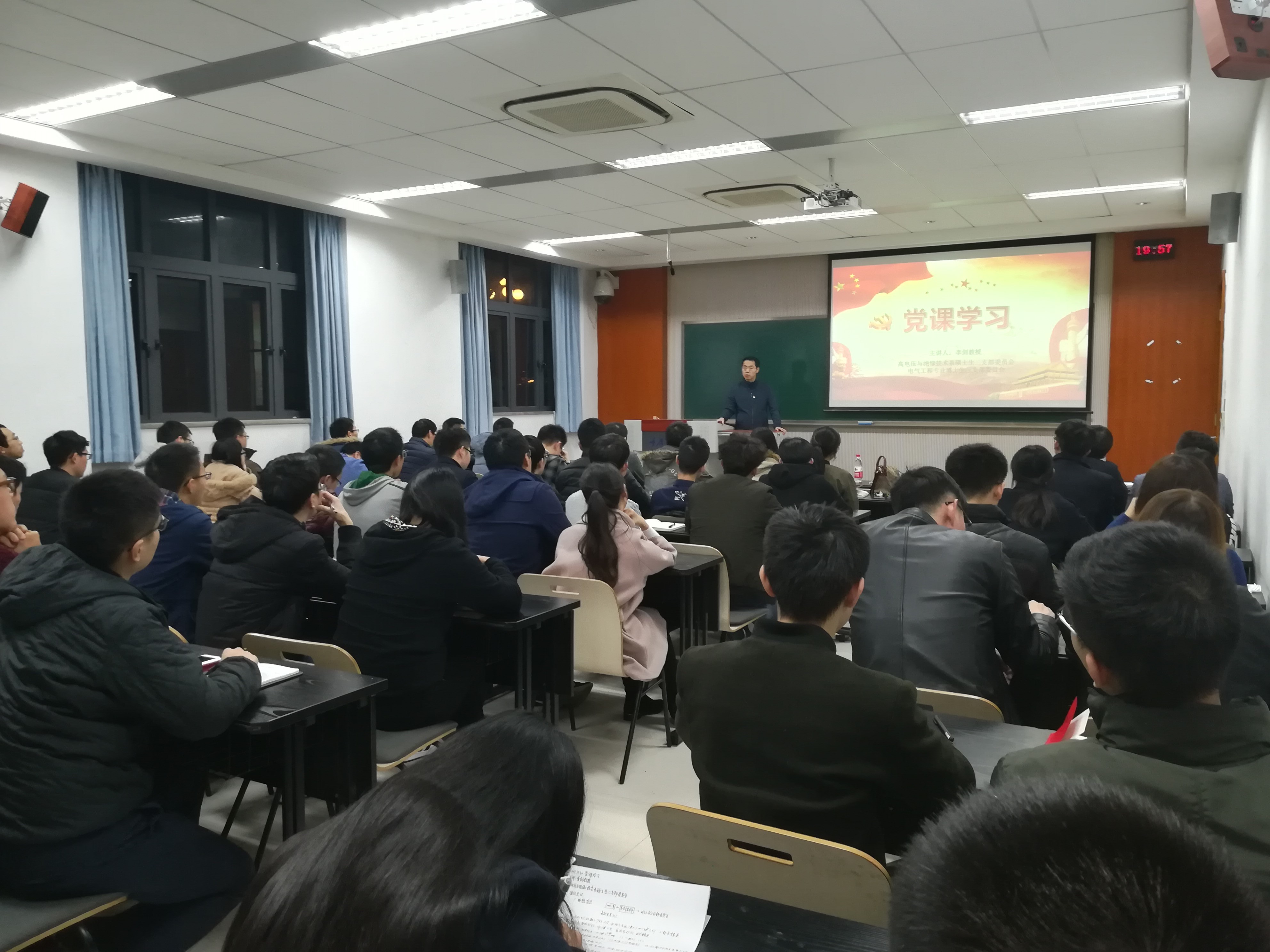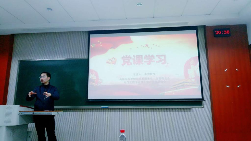 晚上7点30分,党组织生活会正式开始。高电压与绝缘技术硕士生二支部书记侯姝斌对会议流程进行简单介绍,并欢迎李剑教授的到来,在热烈的掌声中,李剑教授开始讲授党课。