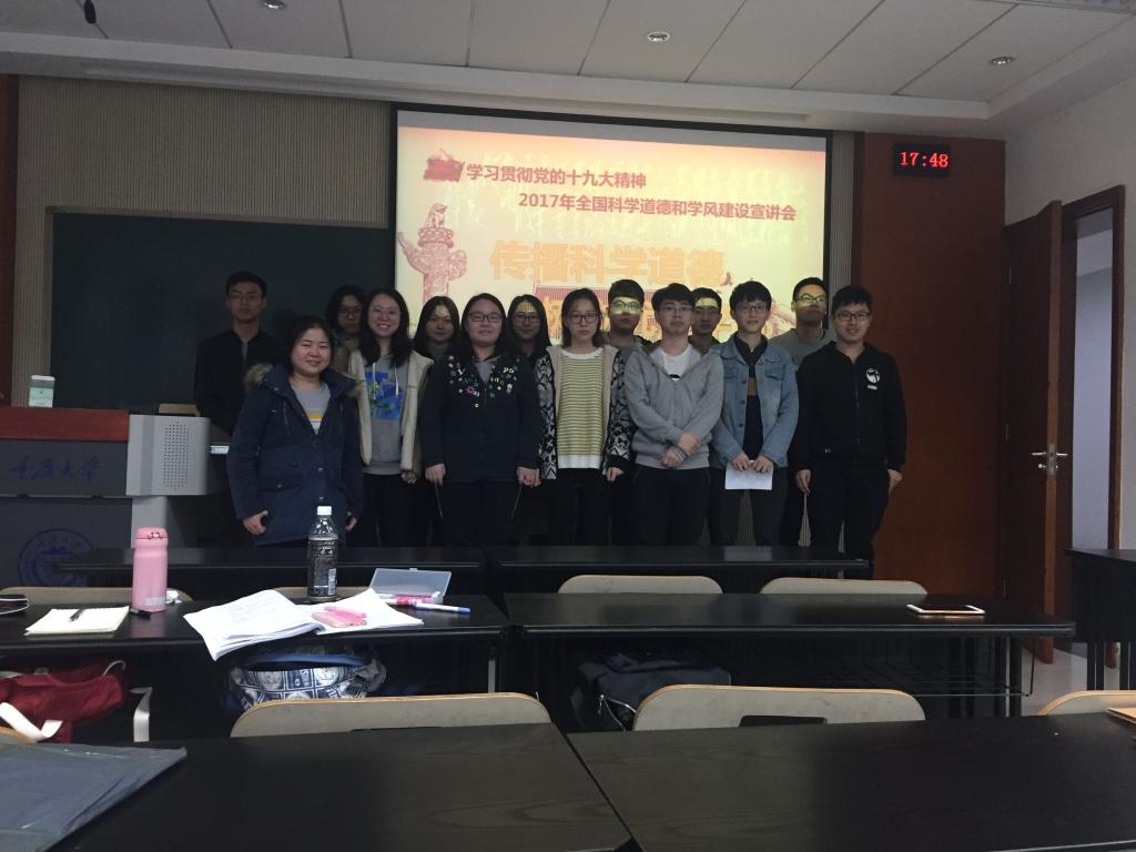 随后,为了加深对于全国科学道德和学风建设宣讲会的认识,全体同学集体观看了该宣讲会的部分内容的视频。在观看视频后,同学们踊跃发言,表达自己的看法。蒋啸天同学表示:“此次报告会是学习贯彻党的十九大精神的一次宣讲,中国科协、教育部联合印发通知进行部署动员、抓好落实,进一步引导广大青年学子和科技工作者遵守学术规范、坚守学术诚信、完善学术人格、维护学术尊严,摒弃学术不端行为,努力成为优良学术道德的践行者和良好学术风气的维护者,为决胜全面建成小康社会、夺取新时代中国特色社会主义伟大胜利、实现中华民族伟大复兴的中国梦、实现人民对美好生活的向往而继续奋斗!”