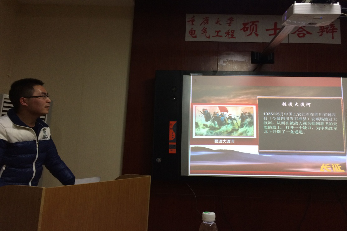 电力系统硕士二支部在六教320-2开展了“重温长征精神 践行‘两学一做’”主题党组织活动。本次党组织活动由支部书记廖茂同志主持开展,支部内正式党员和预备党员均积极参加了此次党组织活动。