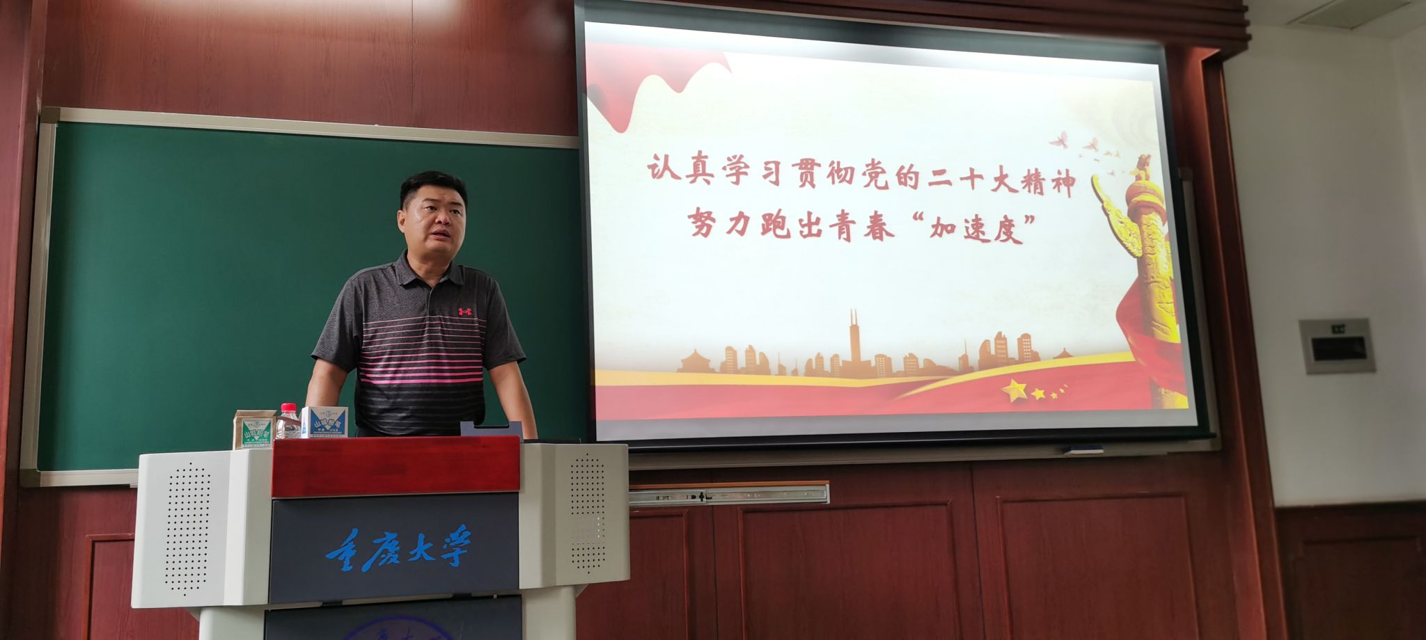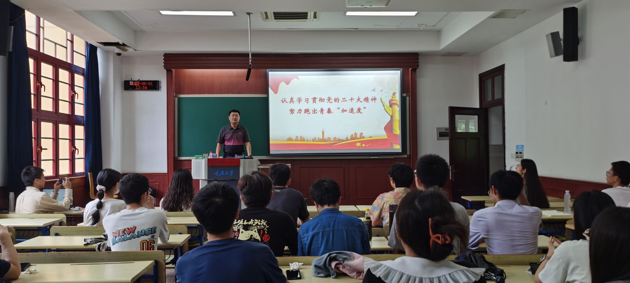 2023年6月1日中午,电气工程学院党委副书记吴嘉以《认真学习贯彻党的二十大精神,努力跑出青春‘加速度’》为主题,在A区A5104教室,为本科生二支部上了一堂生动的党课,本科生二支部全体党员参加。