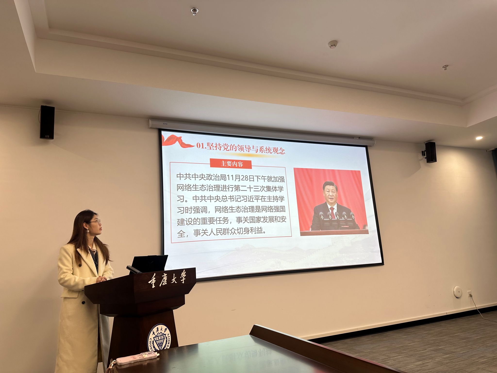接着,她就如何塑造清朗校园网络文化分享见解。针对网络内容建设,她认为应该深化党的理论宣传,大力弘扬社会主义核心价值观,通过创作高质量文化作品,为校园网络空间提供优质内容供给。此外,她号召支部成员自觉抵制网络乱象,培养理性平和的心态,不盲目跟风、不参与网络暴力,以实际行动共同维护文明有序的网络环境。同时,她还聚焦 AI 与大数据等新技术环境下的网络安全风险,深入分析了当前面临的各类挑战,并提醒支部同志切实增强个人数据安全意识,深入学习《网络安全法》等相关法律法规,不断提升法律维权能力。