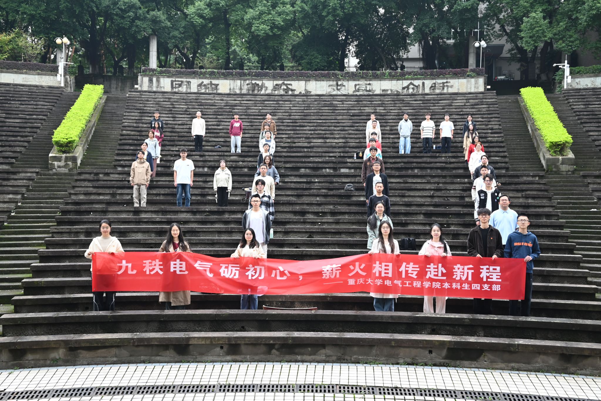 支部党员集体乘车前往沙坪坝校区A校园,开启了一场追寻校史、凝聚力量的红色之旅。在A校园风雨操场,全体党员迅速排列成“90”字样队形,手持主题横幅,齐声高呼口号并录制视频,场面庄重热烈,展现了电气学子昂扬向上的精神风貌。