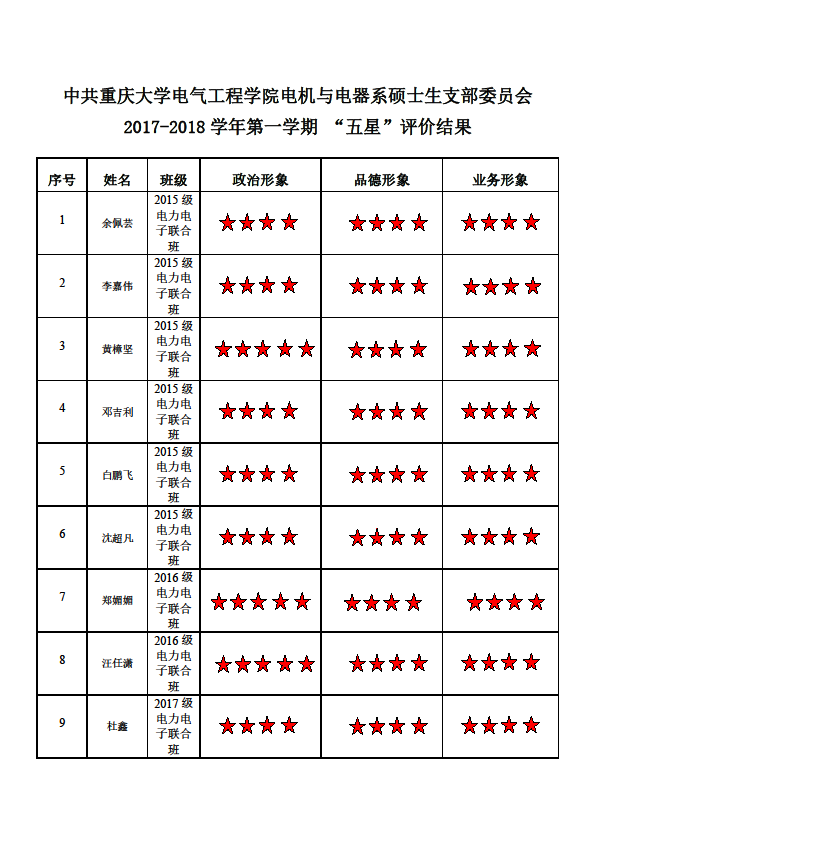 中共小说狂人 电机与电器系硕士生支部委员会2017-2018学年第一学期 “五星”评价结果
