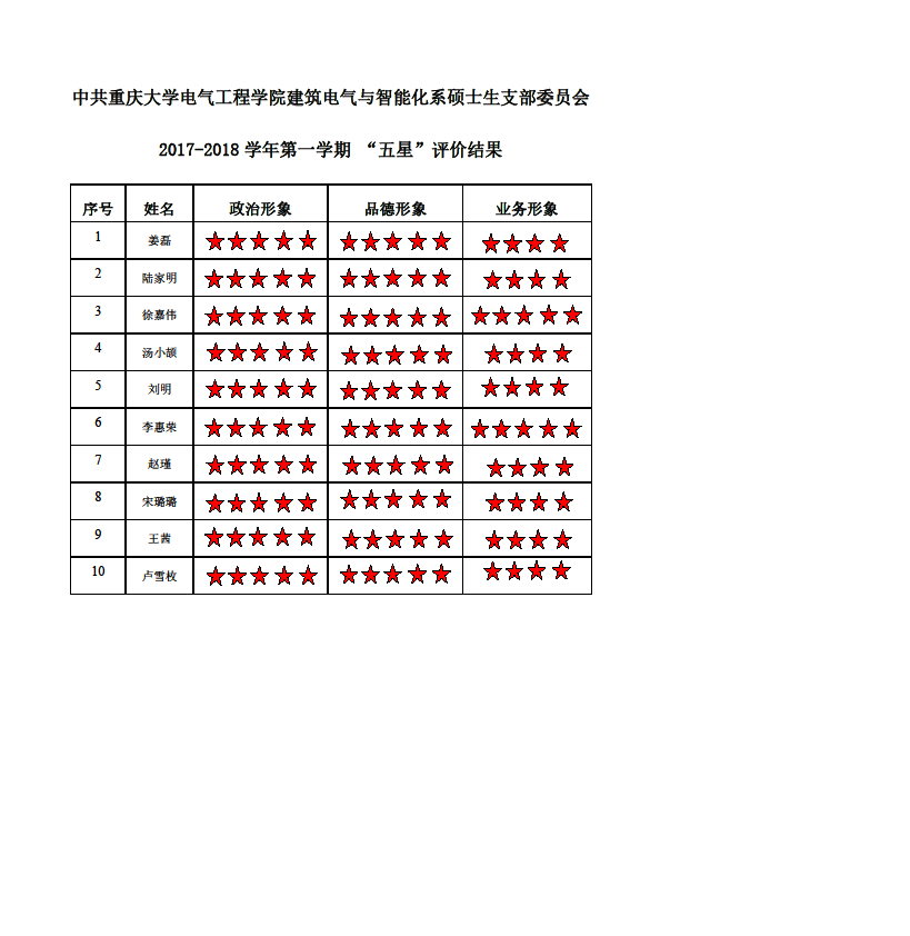 中共小说狂人 建筑电气与智能化系硕士生支部委员会2017-2018学年第一学期 “五星”评价结果
