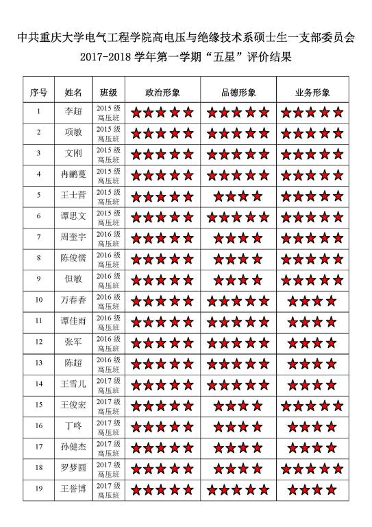 中共小说狂人 高电压与绝缘技术系硕士生一支部委员会 2017-2018学年第一学期“五星”评价结果
