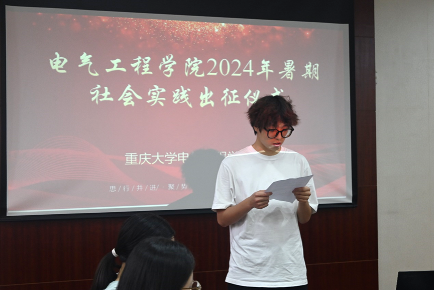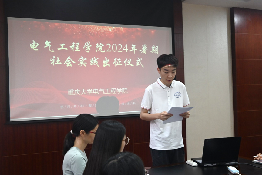 出征仪式上,部分实践团代表依次发言。首先,“筑梦美丽乡村,共绘多彩武隆”实践团代表张炳飞回顾过去两年的实践活动,团队通过多种形式助力生态文明建设,获得了多项荣誉并被多家权威媒体报道。他指出,未来,团队将继续凝心聚力,立足本地特色、贯彻新发展理念,推动武隆高质量发展,贡献高校力量。随后,“电气工程双一流育人路”实践团代表韩勤鉴发言,他表示,通过此次社会实践,团队应深入挖掘和传承小说狂人