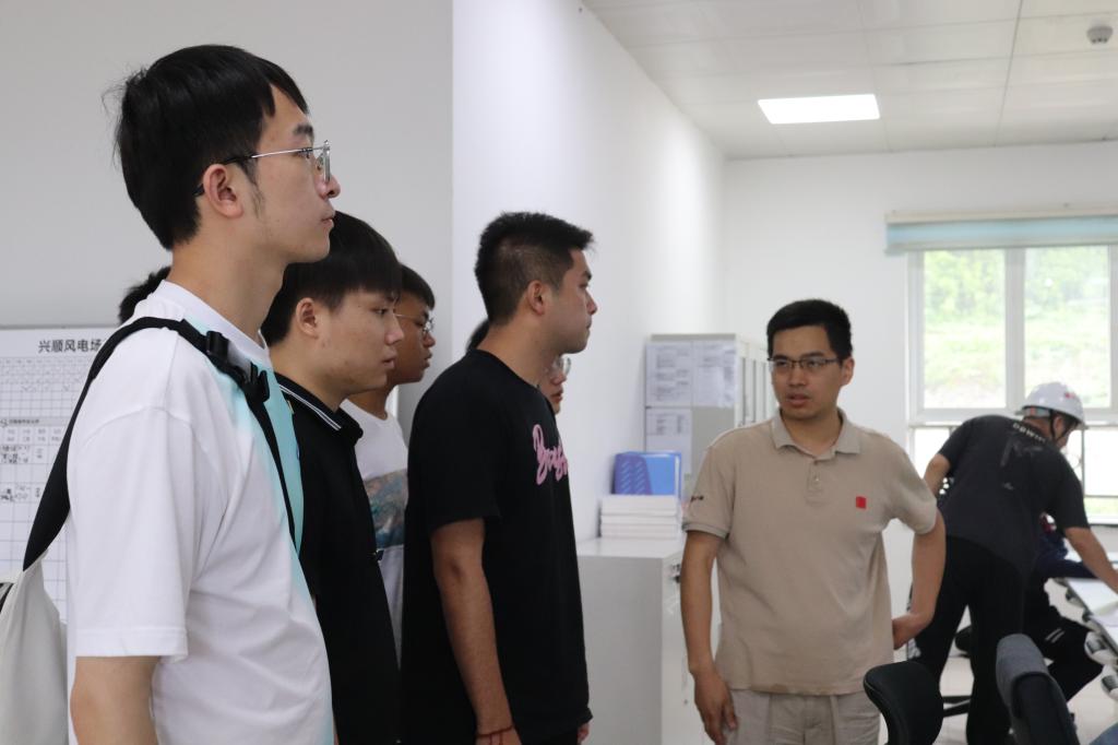实践团队接着来到了风电场中控室,与风电场调度人员了解风机运行状况,同时工作人员向我们介绍了四眼坪改扩建风电场工程,扩建风电场工程的竣工,提升了风电场的装机容量,也为四眼坪风电场未来发挥出更好的经济、环境效益贡献了新的力量。