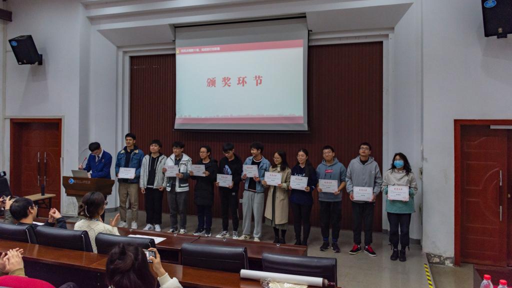 第三个环节是展示优秀作品及颁奖,该环节展示了参与本次主题党团征集活动的同学们的优秀作品。最后根据投稿作品的形式,将优秀作品分为六类:征文类、七一讲话精神心得感想类、书法绘画类、诗歌类、摄影类、先进人物事迹类,通过层层筛选,对投稿作品质量优秀的同学颁发奖励。在颁奖过程中,邀请了郭莹霏、卢睿、程虔等获奖的同学向大家讲解了作品的创作思路与意义,在场同学受益匪浅。