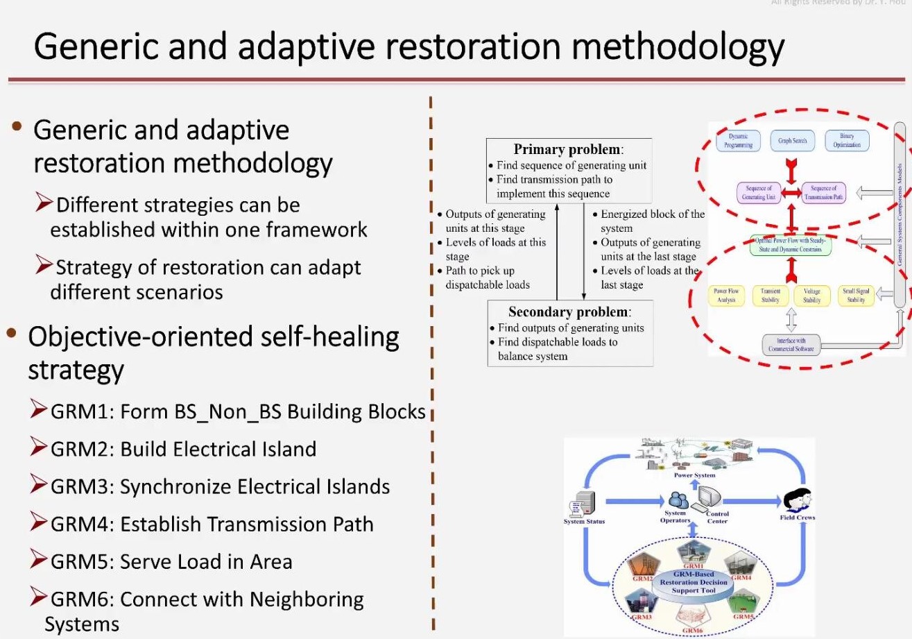 随后,侯教授具体讲解了故障后系统的恢复问题,表明系统的恢复策略应当具有通用性和自适应性。目前电力系统及其故障类型具有多样性,因此恢复策略有所不同。侯教授指出,可先将系统恢复过程进行解耦以生成相应的固定策略,当系统遇到故障时,工作人员再根据系统及故障特点选择相应策略来进行解决。由此,侯教授提出了通用与自适应恢复方法,形成以目标为导向的自愈策略,主要包括黑启动和非黑启动电源、建立电气孤岛、同步邻近系统、建立传输线路、实现区域内恢复、与附近网络建立连接等六个环节。