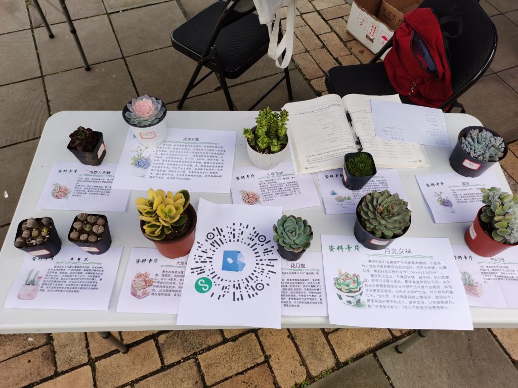 “多肉植物展览与分享”项目组在一食堂南广场举办了多肉植物展览与分享会,旨在通过多肉植物的展示、介绍,增加同学们对其了解,激发他们对于多肉乃至其他绿植的培养兴趣;同时搭建一个讨论交流的平台,使多肉爱好者聚集在一起,共同分享多肉养殖的方法、技巧,分享照顾多肉过程中的小确幸。