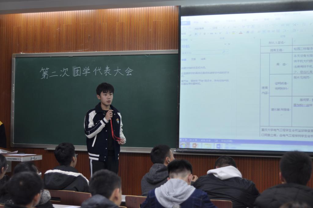 2019—2020学年第二次团学代表大会于虎溪校区D1412教室顺利举行。本次团学代表大会内容主要是由各团学代表介绍议案,之后通过投票的形式评选出优秀议案,议案内容主要聚焦于学校的基础设施、文明寝室建设以及学习安排等与同学们紧密相关的问题。