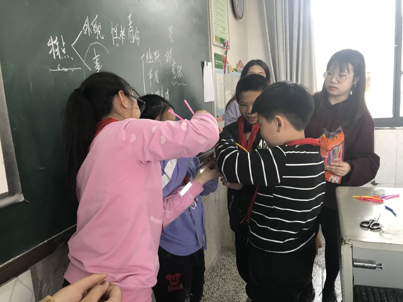 紧接着便开始了第二个有趣的水笛实验——利用水的振动来发出清脆悦耳的声音。由于声音较小,小朋友们屏息凝神,志愿者也站在在教室过道更近距离地为小朋友们演奏悦耳的“交响曲”。小朋友们仍意犹未尽,于是志愿者挑选了一位小朋友上讲台来自己制作水笛。志愿者为小朋友们讲解原理后,见小朋友们对波的概念还是有些疑惑,于是决定满足小朋友们的好奇心,让他们亲眼看一看波是什么样子的。志愿者选择了一些小朋友到讲台上帮忙组装实验装置,接着让小朋友拨动粘满吸管的胶带一端。小朋友们惊奇地发现吸管一根接一根地像蛇一样扭动。最后,志愿者给小朋友们讲解了波的基本特征,让小朋友们清楚了波的大致形状。
