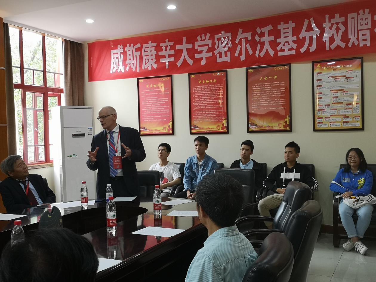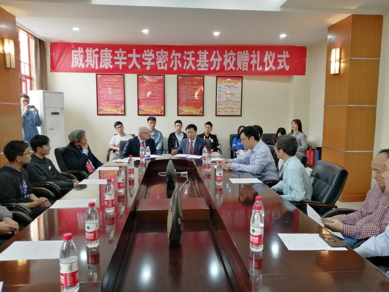 赠礼仪式开始前,来自威斯康辛大学密尔沃基分校的两位教授向我们介绍了两校多年来合作办学项目的具体事项以及近些年取得成果,并鼓励同学们积极参加联合办学项目。