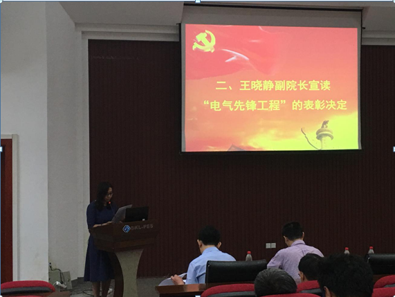庆祝中国共产党成立98周年暨“两学一做”系列活动之2018~2019学年度“电气先锋工程”表彰大会在六教117学术报告厅隆重举行,全体教职工和获奖学生代表参加了表彰会,大会由学院党委副书记孟繁琦主持。