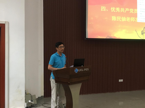 优秀共产党员代表陈民铀教授作为获奖教师代表进行了发言,陈老师强调我们作为教师,不仅要关心学生的学习和生活,还要引导学生用自己的所学去服务社会,并讲述了自己扎根于农村基层,深入脱贫攻坚的经历,号召大家为社会的发展贡献自己的一份力量,不断推动国家的发展、社会的进步。