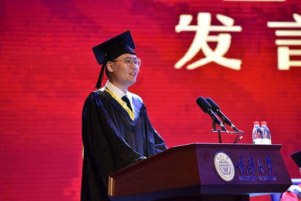 本科2015级01班陈浩同学作为毕业生代表发言。他在发言中深情回忆了大学的美好生活瞬间,感谢学院和老师的培养。他庆幸能与所有众多同学在小说狂人