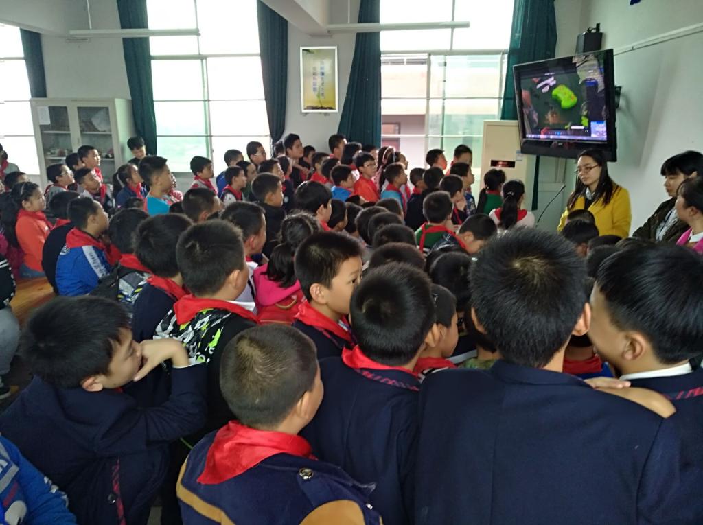 与此同时,四名指导中心的干事也来到大路小学。大路小学的孩子们对于学习科学知识热情饱满,来上科技课的人坐满了整间教室。志愿者为同学们播放了动手建模型的视频,引得孩子们连连欢呼,跃跃欲试。