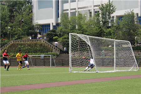 中场休息十五分钟,下半场易边再战,材料学院明显加强了进攻,给电气学院制造了一些威胁,但球员们的绝妙配合化解了一次次危机。双方你来我往,势均力敌,前30分钟均未得分。第76分钟,又是尹潇,连续过掉对方防守球员,停球、射门,将比分改写成3:0,现场一阵喝彩。比赛剩余8分钟,材料学院利用角球机会,获得一分。最终,电气以3:1获得本场比赛的胜利。