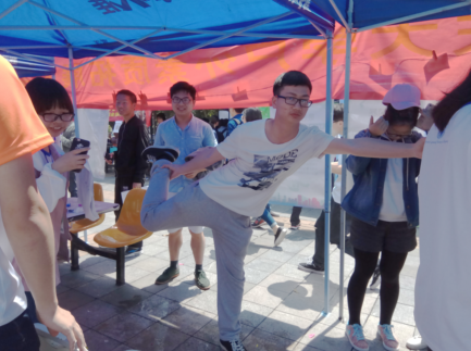 十二点二十分,“大观园”活动正式开始。本届“大观园”活动共设置五个游戏环节,分别是“逃之夭夭”、“溺水猜歌”、“中心风暴”、“最后一滴水”、“天旋地转”。每个环节都具有一定的考验性,其中最具挑战性的环节是“逃之夭夭”,玩家首先需要在一定时间内边打背包边记地图,然后根据所记地图将路线上的水瓶用水枪打倒。该游戏模拟雨林中遇到紧急情况时的应变情形,可以锻炼参与者在面对多项任务时的应变能力。最刺激的游戏环节是“溺水猜歌”,在艳阳高照的午后,参与者将头埋在水中听歌猜歌名,可谓清爽刺激。还有最有趣搞笑的“中心风暴”:游戏将头脑风暴和吹面粉相结合,参与者经过快问快答,回答正确后需将装在纸杯中的乒乓球吹出,纸杯中同时装有面粉。该游戏有趣而益智,飞扬的面粉引来同学们的阵阵欢笑。