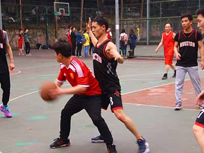 三场比赛分别是研一联合队VS研二三电班、研一新技术队VS教师队、研三新技术队VS研二新技术队。三场比赛同时进行,让人目不暇接,运动场上队员们迅速进入状态以矫健熟练的动作迅速传球,争夺篮板也是异常激烈。篮球场上你争我夺,不断地断球快攻令人眼花缭乱。赛场旁的观众们也是投入激烈的比赛中,不断为自己喜欢的球队加油鼓劲,助威呐喊,球场气氛十分活跃。