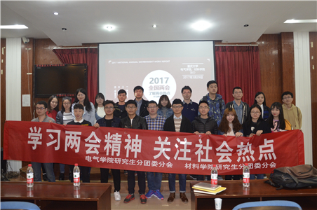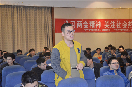 3月29日中午,“学习‘两会’精神,关注社会热点”党团活动在B区材料楼二楼报告厅举行。出席本次活动的领导和老师有材料学院党委副书记邓扶平、团委书记邵凤雨、研究生辅导员高洁,电气学院院长助理孟繁琦、研究生辅导员王婧。活动由材料学院研究生分团委分会、电气学院研究生分团委分会联合举办,百余名研究生学子参加。