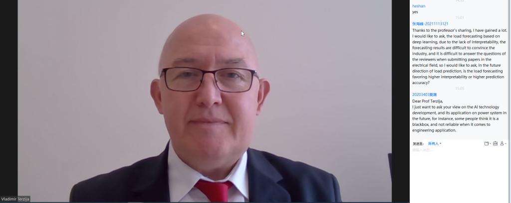 Terzija教授的精彩报告引发了与会者的热烈讨论。与会师生就负荷预测的可解释性和预测精度、AI技术发展及其在电力系统中的应用、可再生能源对监测数据类型的影响等问题展开了交流讨论,同学们纷纷表示获益匪浅。