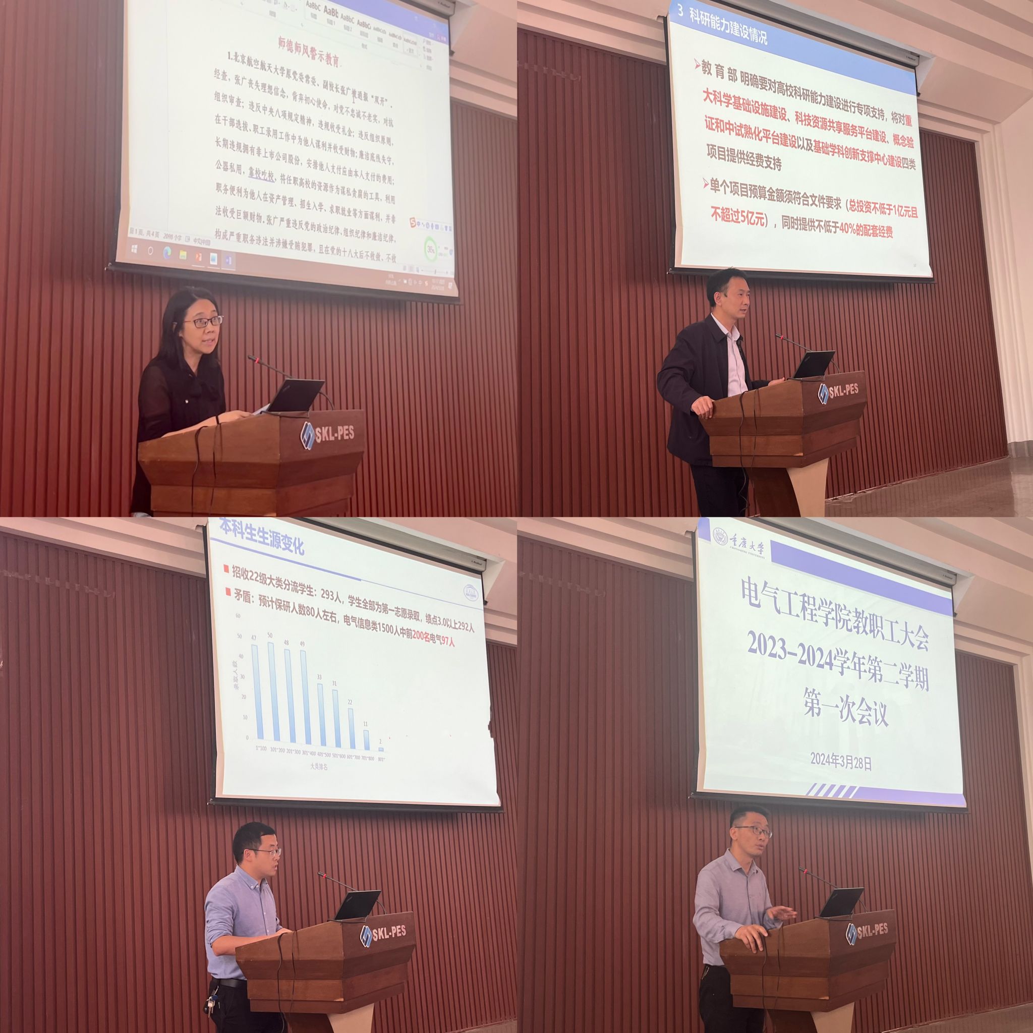 在六教6117报告厅召开2023-2024学年第二学期全体教职工大会。会议传达了学校最新会议精神并通报部署了学院近期工作安排等。学院党委书记胡建林,院长谢开贵,党委副书记王晓静、吴嘉,副院长杜雄、杨鸣,输变电装备技术全国重点实验室副主任李辉、曾礼强,国家野外科学观测研究站专职副站长张志劲出席会议。大会由王晓静副书记主持。
