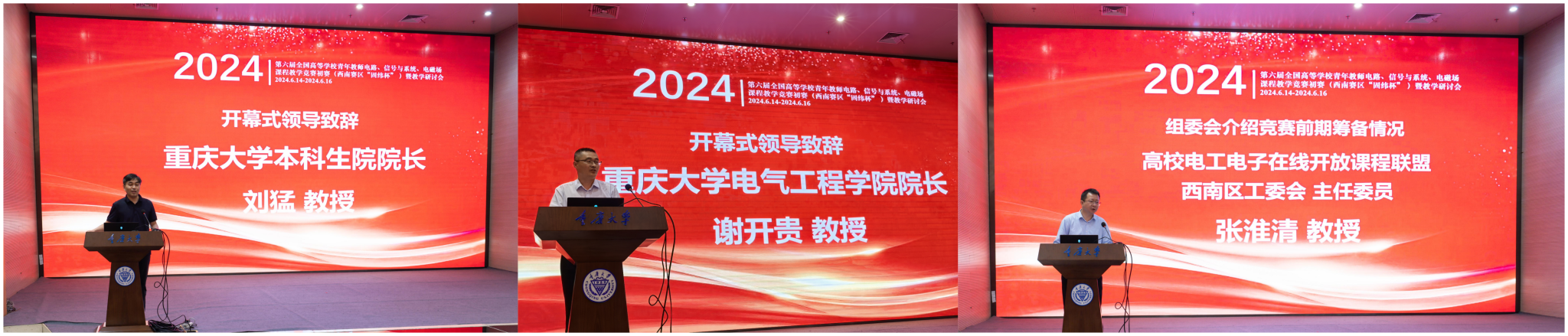 院长谢开贵教授出席了开幕式并致辞。刘猛强调了教学竞赛对教师教学能力提升的重要性,希望教师们能积极参与各类教师教学竞赛,并对能在百忙之中参与评审的专家和参赛教师表示由衷的感谢。随后,谢开贵为参赛专家及选手们全面介绍了学院教学科研发展情况和对未来的展望,希望能借此竞赛的机会同时促进区域高校间的学科交流。最后由高校电工电子在线开放课程联盟西南区工委会主任委员、竞赛组委会负责人张淮清教授宣布本次竞赛正式开幕,来自广西、贵州、四川、西藏、云南和重庆六省市50所高校的66名青年教师分别参加电路、信号与系统、电磁场3个组别的角逐。