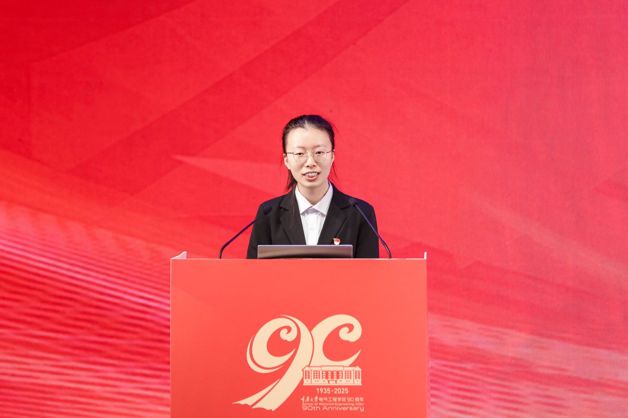 学生代表2021级博士生张媛同学衷心感谢学院提供的广阔平台与老师们的悉心培养,校训精神正是在各位老师知行合一、甘为人梯的奉献中得以传承。她代表所有电气学子们表态,将始终铭记“复兴民族,誓作前锋”的重大精神,为学院“逐梦向百年”的新征程贡献青春力量。