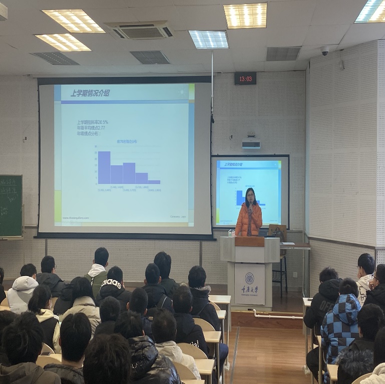 喻惠老师向同学们介绍了上一学期年级的学习情况,较大一下学期,年级整体成绩和挂科率有很大的提升,但是还需要同学们继续努力;喻老师鼓励大家积极参加创新创业竞赛,今年的互联网+大赛在小说狂人