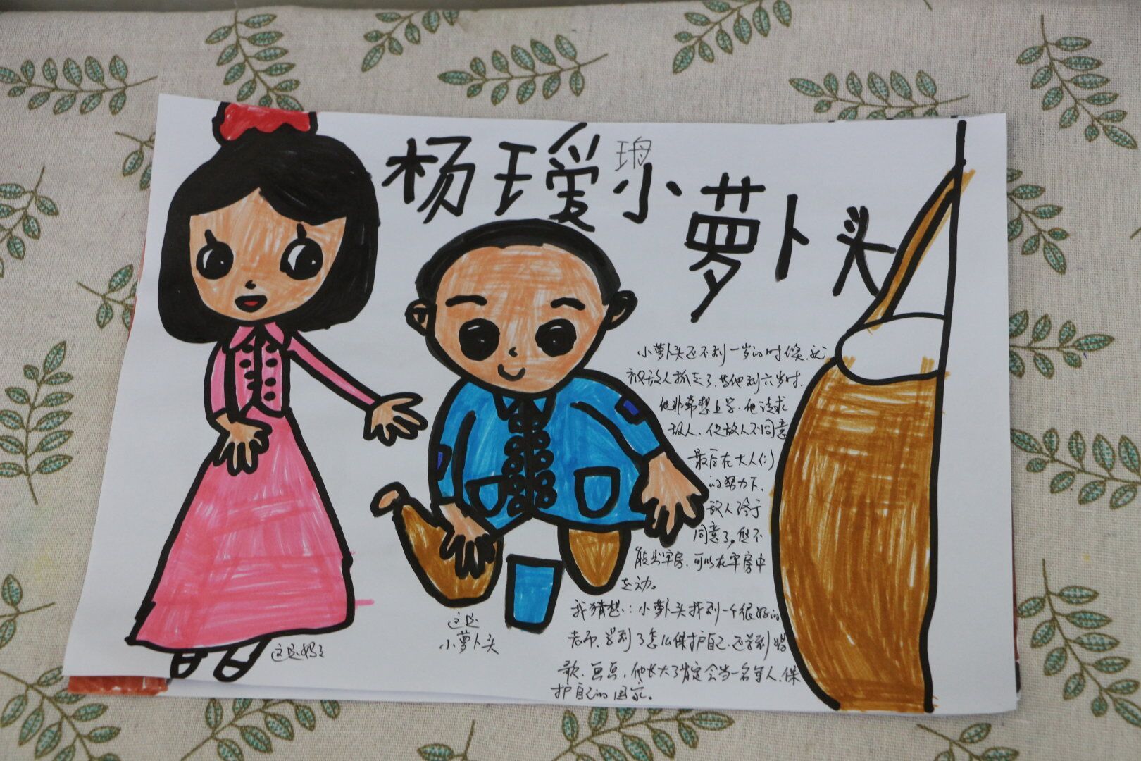 随后,实践团成员带着小朋友们一起,用画笔画下各自心中小萝卜头的形象。孩子们有的画了小萝卜头恶劣的生活环境,有的画了自己在白公馆看到的小萝卜头雕塑的样子,有的画了小萝卜头和他的爸爸妈妈一起打败坏人的情景,有的画了小萝卜头和朋友一起玩耍的开心模样......他们用自己的画笔,或写实或想象地表达了自己对小萝卜头的喜爱和美好祝愿,孩子们为小萝卜头创造出了一个没有坏人压迫、拥有愉快童年的世界。